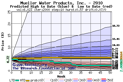 The high to date and low to date prices of the stock plotted against a random walk model for 2010 (what's this?).