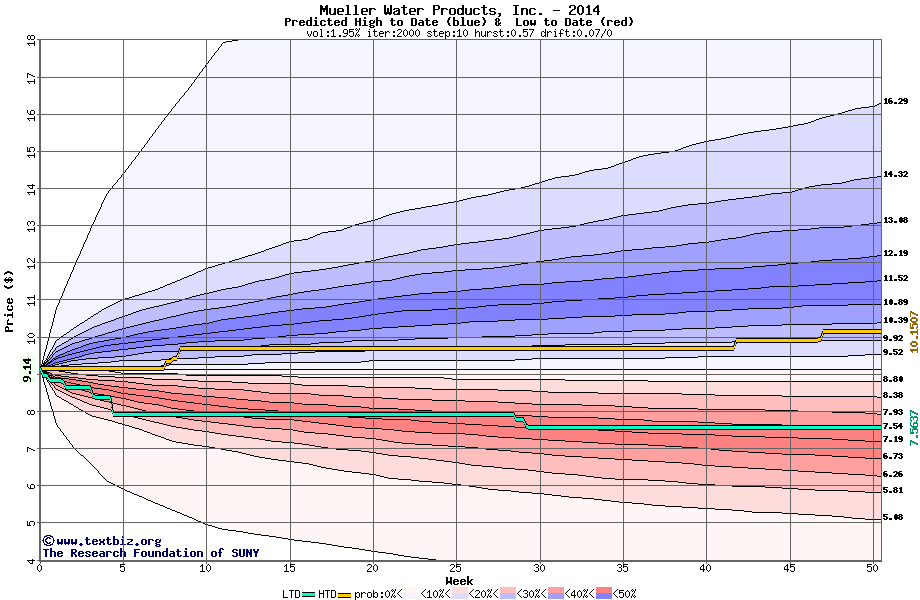 The high to date and low to date prices of the stock plotted against a random walk model for 2014 (what's this?).