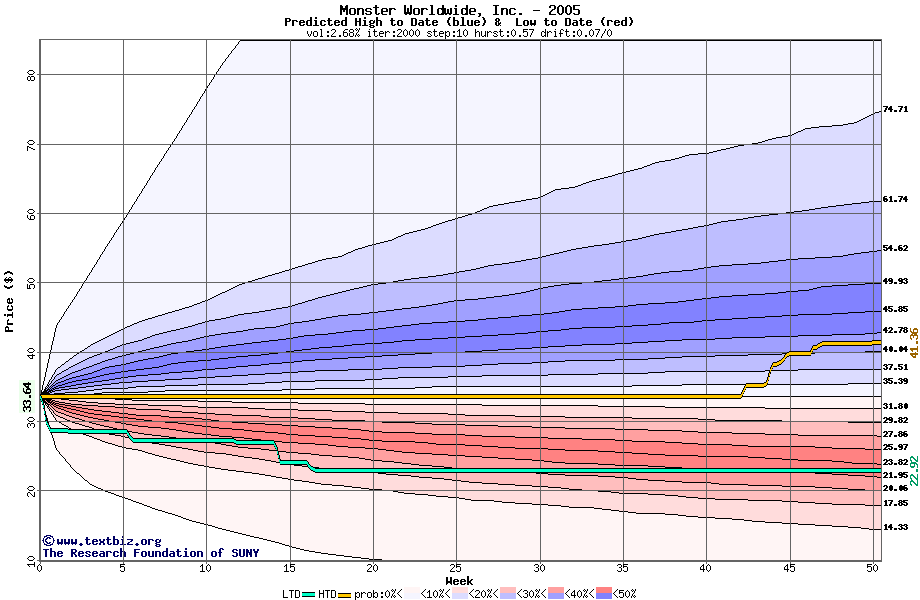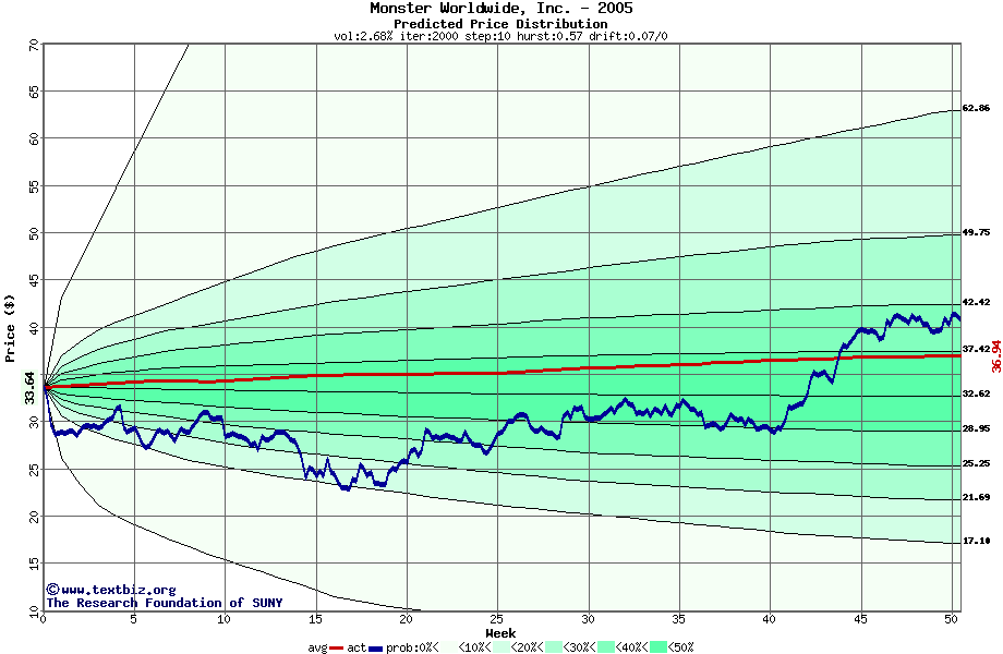 The following graph plots the year-to-date performance of the stock for 2005 compared to the probability calculated by a random walk model.