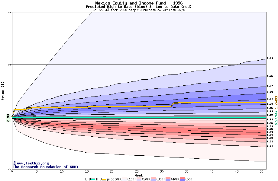 The high to date and low to date prices of the stock plotted against a random walk model for 1996 (what's this?).