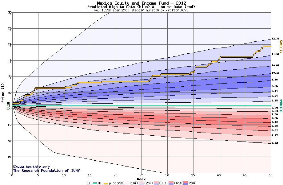 The high to date and low to date prices of the stock plotted against a random walk model for 2012 (what's this?).