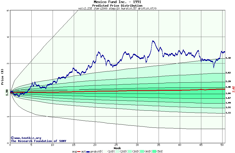 The following graph plots the year-to-date performance of the stock for 1991 compared to the probability calculated by a random walk model.