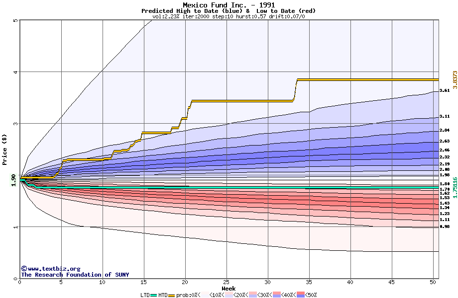 The high to date and low to date prices of the stock plotted against a random walk model for 1991 (what's this?).