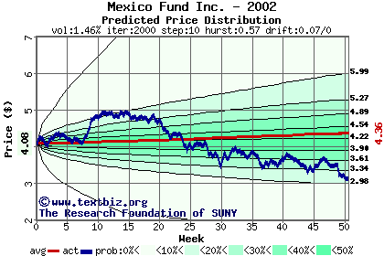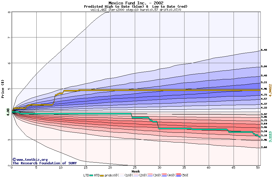 The high to date and low to date prices of the stock plotted against a random walk model for 2002 (what's this?).