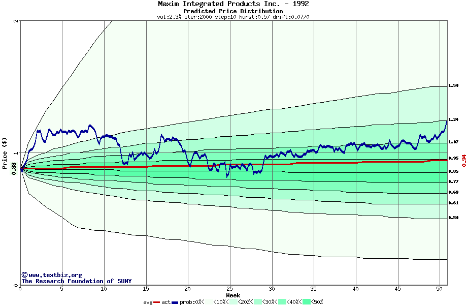 The following graph plots the year-to-date performance of the stock for 1992 compared to the probability calculated by a random walk model.