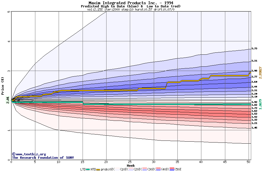 The high to date and low to date prices of the stock plotted against a random walk model for 1994 (what's this?).