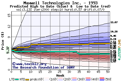 The high to date and low to date prices of the stock plotted against a random walk model for 1993 (what's this?).