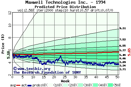 The high to date and low to date prices of the stock plotted against a random walk model for 1994 (what's this?).