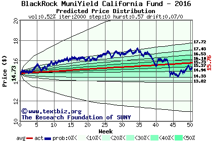 The high to date and low to date prices of the stock plotted against a random walk model for 2016 (what's this?).