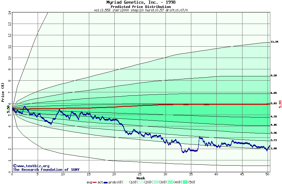 The following graph plots the year-to-date performance of the stock for 1998 compared to the probability calculated by a random walk model.