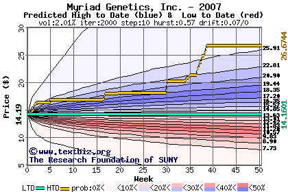 The high to date and low to date prices of the stock plotted against a random walk model for 2007 (what's this?).