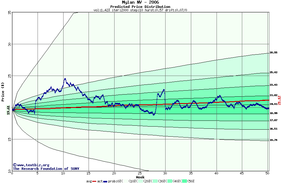 The following graph plots the year-to-date performance of the stock for 2006 compared to the probability calculated by a random walk model.