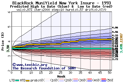 The high to date and low to date prices of the stock plotted against a random walk model for 1993 (what's this?).