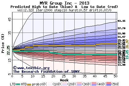 The high to date and low to date prices of the stock plotted against a random walk model for 2013 (what's this?).