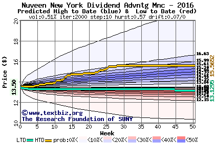 The high to date and low to date prices of the stock plotted against a random walk model for 2016 (what's this?).