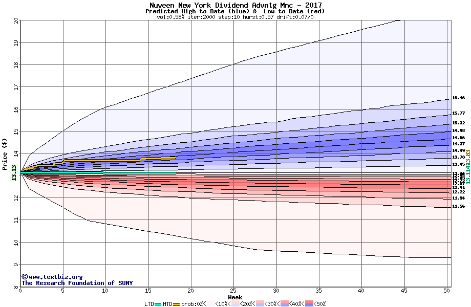 The high to date and low to date prices of the stock plotted against a random walk model for 2017 (what's this?).