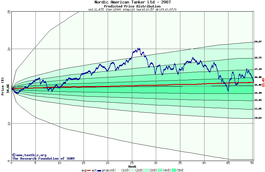 The high to date and low to date prices of the stock plotted against a random walk model for 2007 (what's this?).