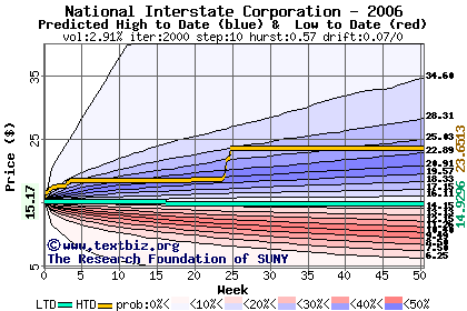 The high to date and low to date prices of the stock plotted against a random walk model for 2006 (what's this?).