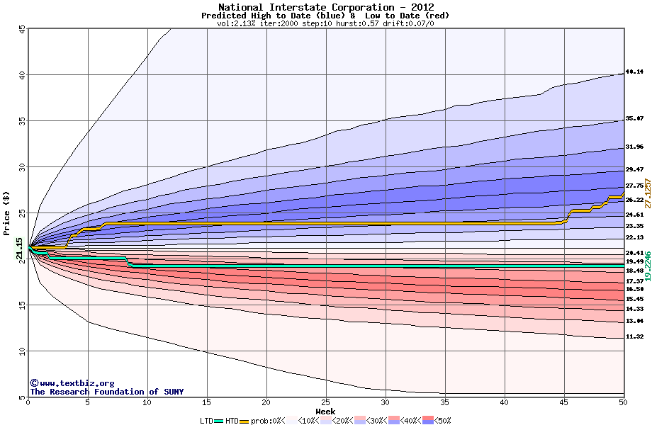 The high to date and low to date prices of the stock plotted against a random walk model for 2012 (what's this?).