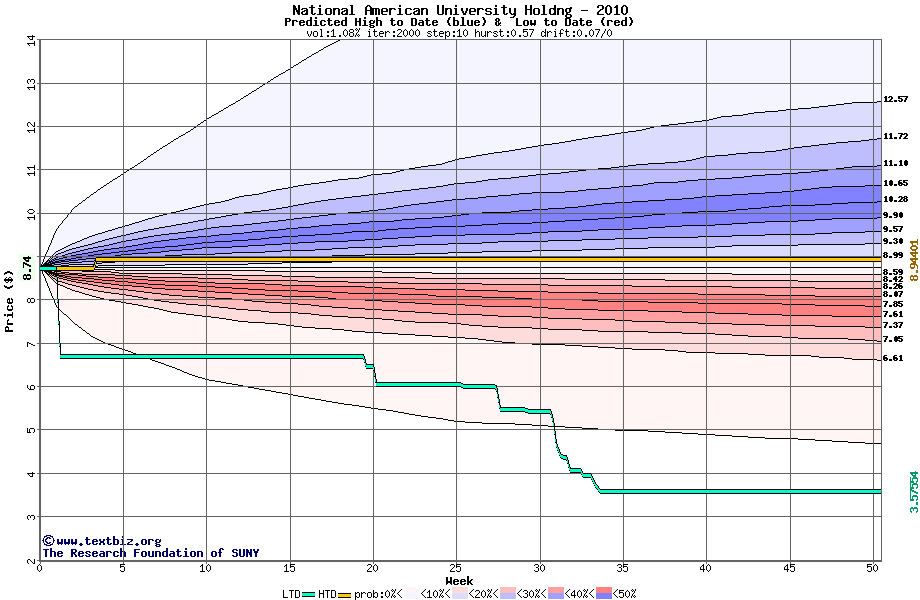 The high to date and low to date prices of the stock plotted against a random walk model for 2010 (what's this?).