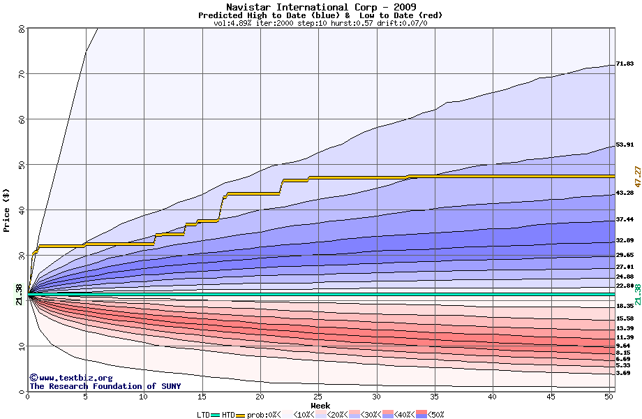 The high to date and low to date prices of the stock plotted against a random walk model for 2009 (what's this?).