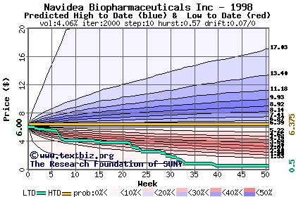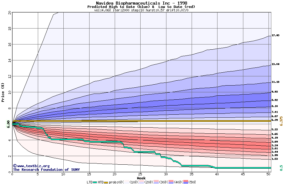 The high to date and low to date prices of the stock plotted against a random walk model for 1998 (what's this?).