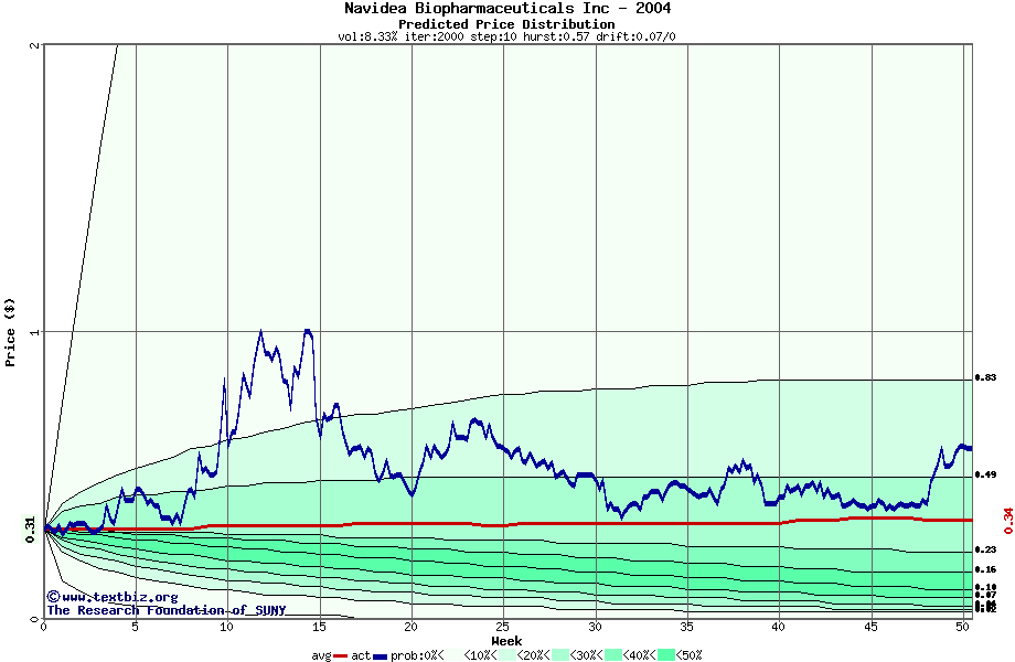 The following graph plots the year-to-date performance of the stock for 2004 compared to the probability calculated by a random walk model.