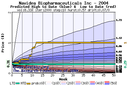 The high to date and low to date prices of the stock plotted against a random walk model for 2004 (what's this?).