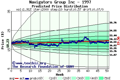 The high to date and low to date prices of the stock plotted against a random walk model for 1997 (what's this?).