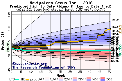 The high to date and low to date prices of the stock plotted against a random walk model for 2016 (what's this?).