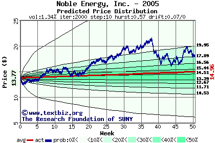 The following graph plots the year-to-date performance of the stock for 2005 compared to the probability calculated by a random walk model.
