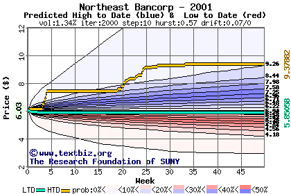The high to date and low to date prices of the stock plotted against a random walk model for 2001 (what's this?).