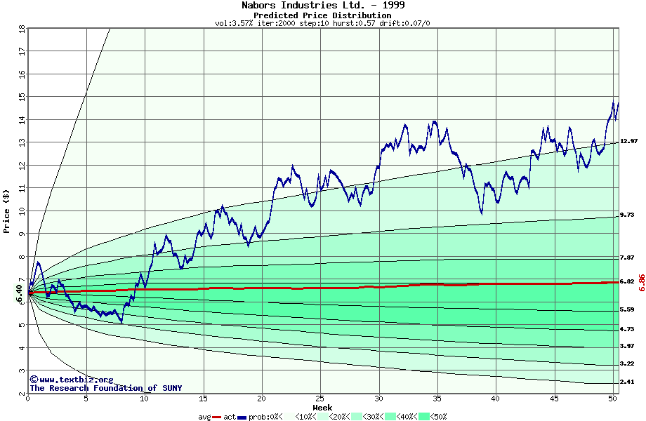 The following graph plots the year-to-date performance of the stock for 1999 compared to the probability calculated by a random walk model.