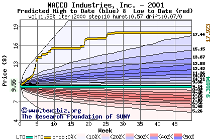 The high to date and low to date prices of the stock plotted against a random walk model for 2001 (what's this?).