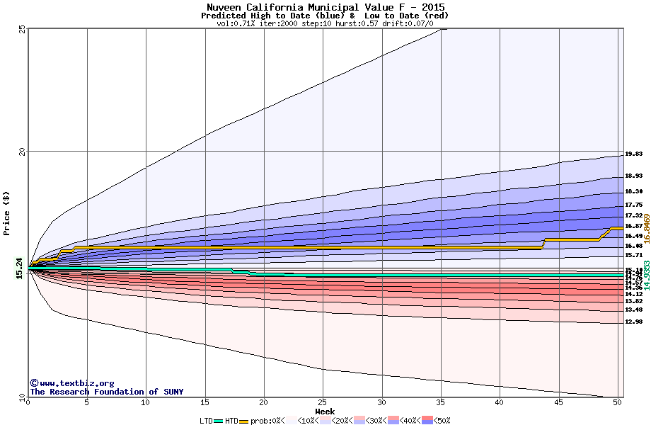 The high to date and low to date prices of the stock plotted against a random walk model for 2015 (what's this?).