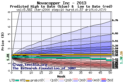 The high to date and low to date prices of the stock plotted against a random walk model for 2013 (what's this?).