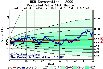 The high to date and low to date prices of the stock plotted against a random walk model for 2000 (what's this?).