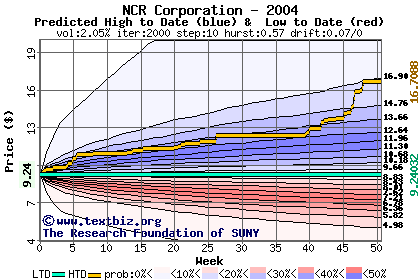 The high to date and low to date prices of the stock plotted against a random walk model for 2004 (what's this?).