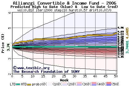 The high to date and low to date prices of the stock plotted against a random walk model for 2006 (what's this?).