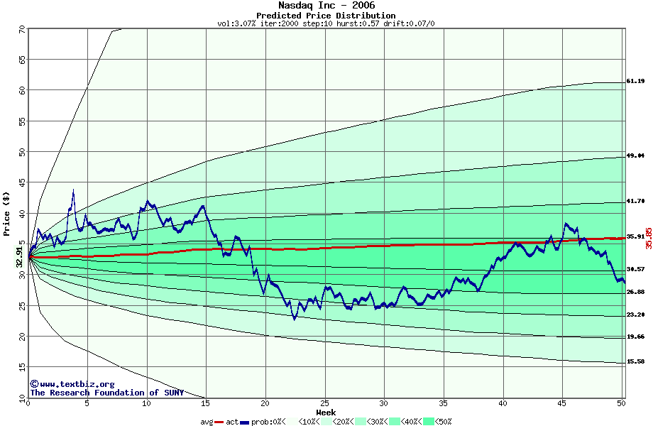 The following graph plots the year-to-date performance of the stock for 2006 compared to the probability calculated by a random walk model.