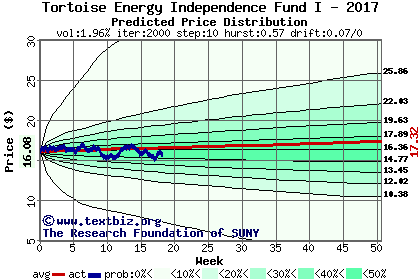 The high to date and low to date prices of the stock plotted against a random walk model for 2017 (what's this?).