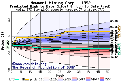 The high to date and low to date prices of the stock plotted against a random walk model for 1992 (what's this?).