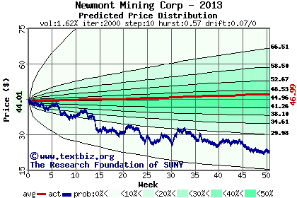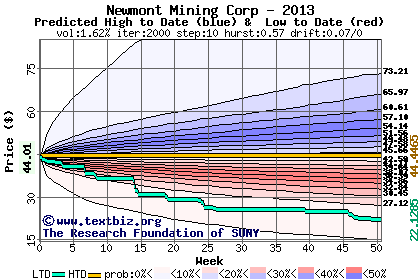 The high to date and low to date prices of the stock plotted against a random walk model for 2013 (what's this?).