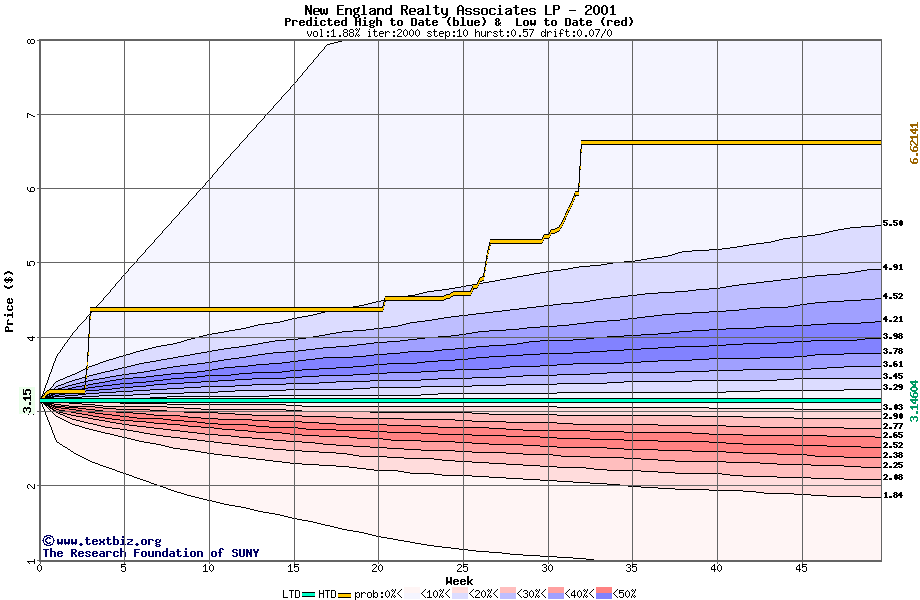 The high to date and low to date prices of the stock plotted against a random walk model for 2001 (what's this?).