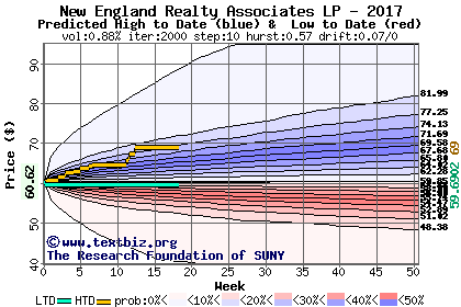 The high to date and low to date prices of the stock plotted against a random walk model for 2017 (what's this?).