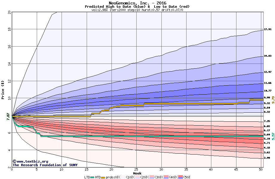 The high to date and low to date prices of the stock plotted against a random walk model for 2016 (what's this?).