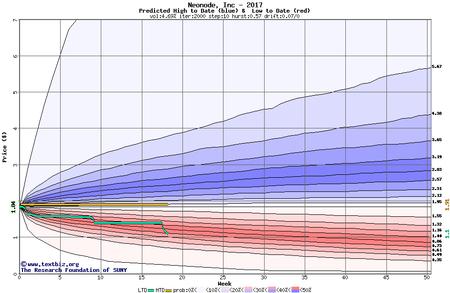 The high to date and low to date prices of the stock plotted against a random walk model for 2017 (what's this?).