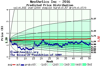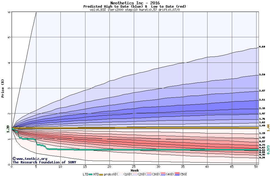 The high to date and low to date prices of the stock plotted against a random walk model for 2016 (what's this?).