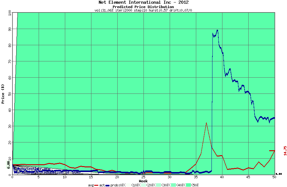 The high to date and low to date prices of the stock plotted against a random walk model for 2012 (what's this?).