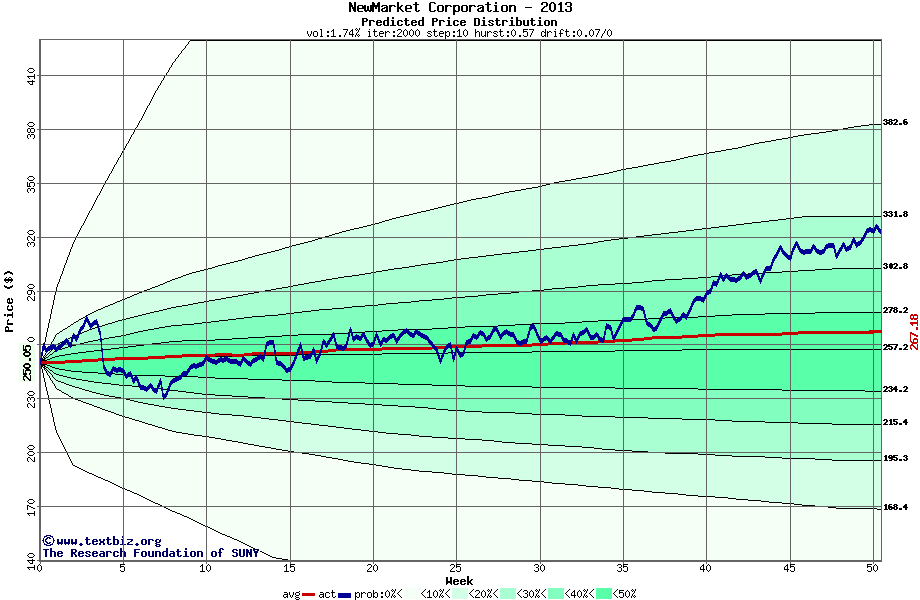 The following graph plots the year-to-date performance of the stock for 2013 compared to the probability calculated by a random walk model.